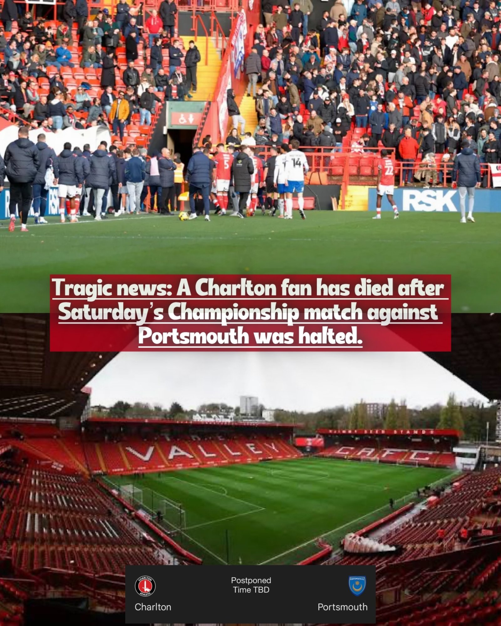 A Charlton Athletic supporter has died after the club’s Championship match against Portsmouth was abandoned on Saturday following a serious medical emergency in the stands.