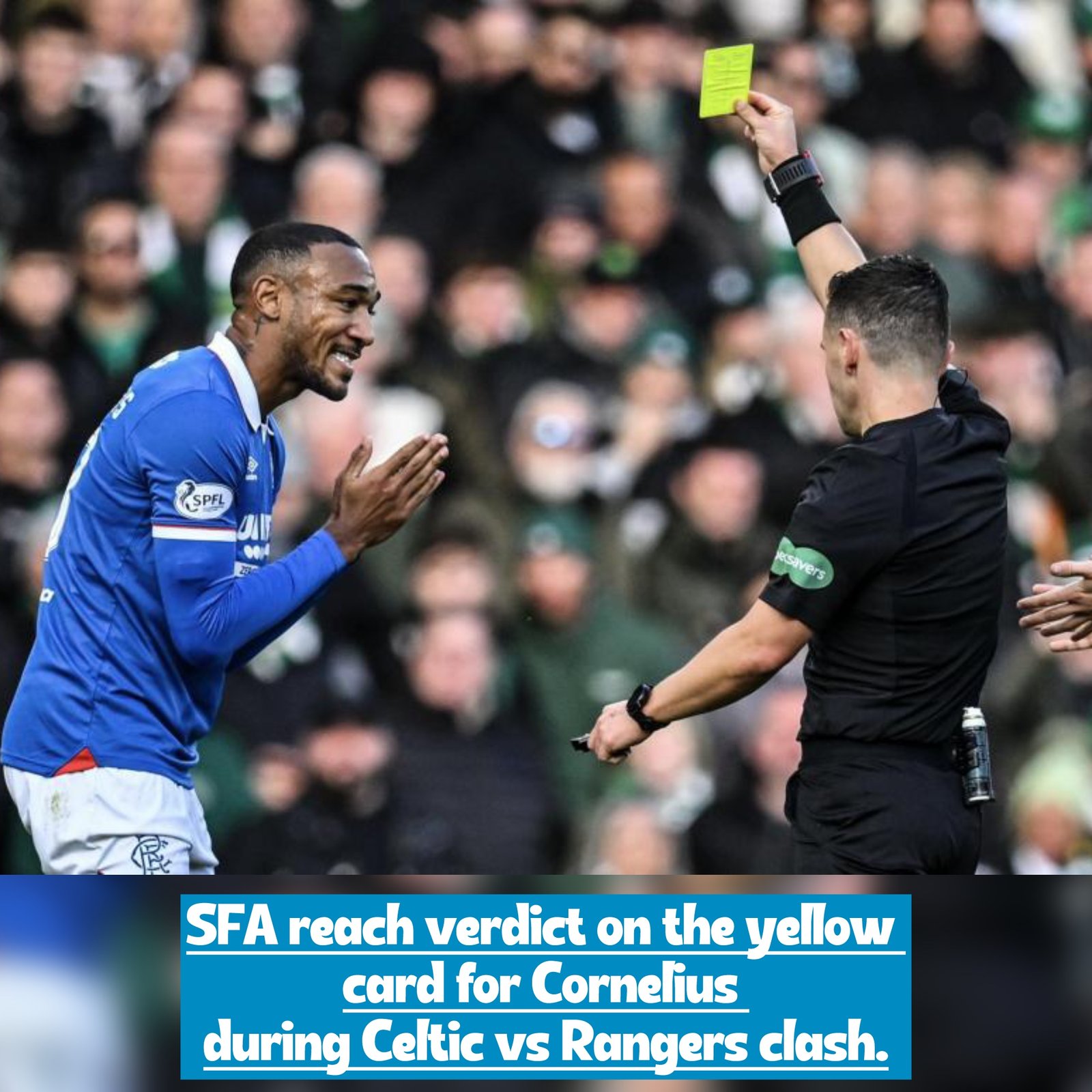 The Scottish FA’s Key Match Incident (KMI) panel has ruled that Derek Cornelius’s yellow card in Rangers’ clash with Celtic was the correct decision. The defender was booked for a tackle on Johny Kenny late in the first half of the Premier Sports Cup semi-final.
